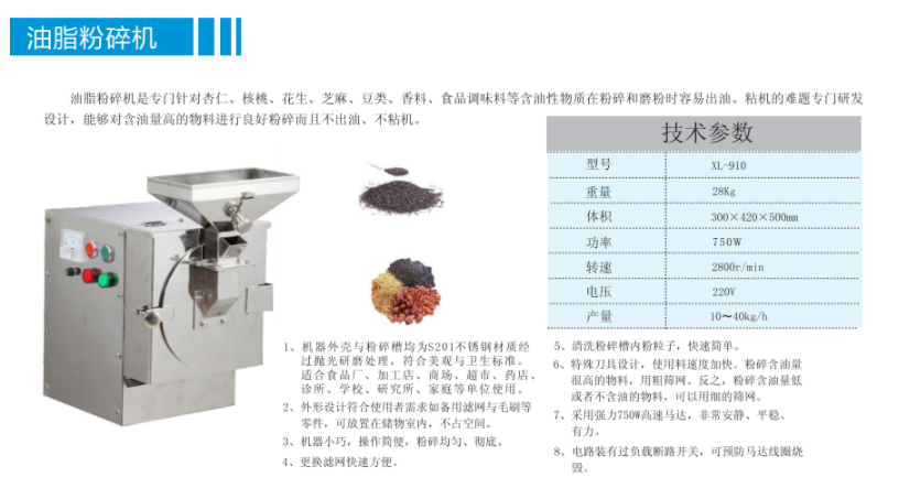 XL-910油脂粉碎機專為容易出油、粘機的難題研發,不銹鋼材質,更換濾網方便快速